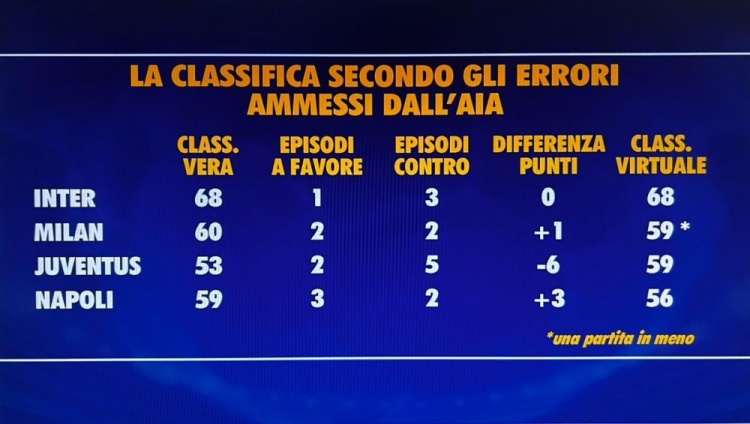 意甲无误判情况下积分榜前四名: