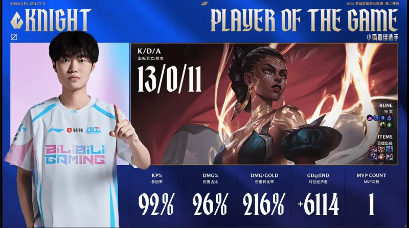 34分钟,Knight梅尔团战输出拉满,BLG众人轻松打出1换5团灭